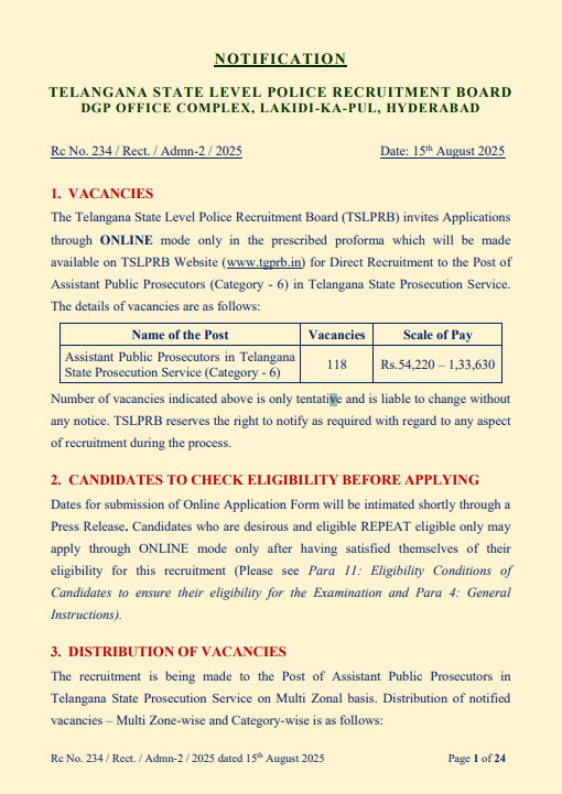 The Telangana State Level Police Recruitment Board (TSLPRB) has officially announced recruitment for 118 Assistant Public Prosecutor (APP) positions under category-6 of the Telangana State Prosecution service.